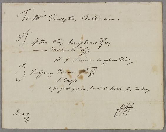 | Summary | Recipe by A. M., for Mrs Foresythe. On the reverse in a different hand, 'the liniment was applied after washing the arm with soap and water and a little flower of mustard'. The recipe is most likely from Dr (Alexander?) Haliday. His initials at the end of the recipe resemble his signature. |