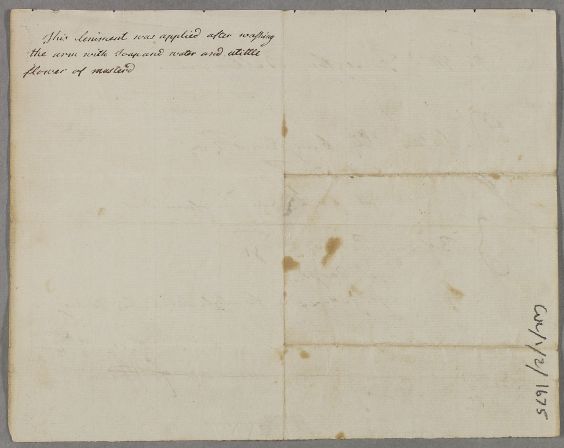 Recipe by A. M., for Mrs Foresythe. On the reverse in a different hand, 'the liniment was applied after washing the arm with soap and water and a little flower of mustard'. The recipe is most likely from Dr (Alexander?) Haliday. His initials at the end of the recipe resemble his signature.