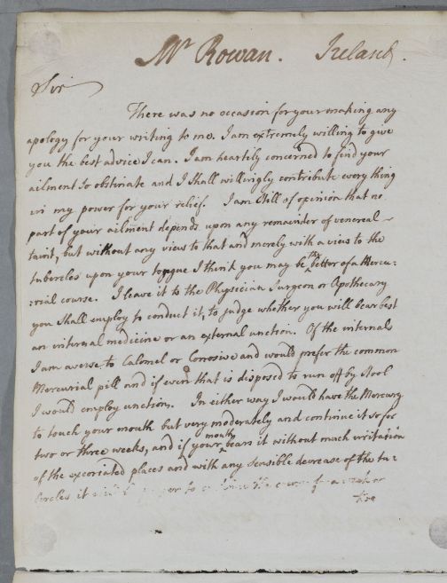 | Summary | Directions for Mr Rowan, whose ailments Cullen believes are not venereal in nature. |
