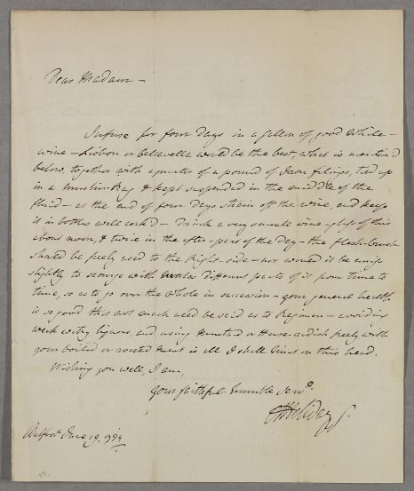 Letter from Dr Haliday to Mrs Forsaythe, giving directions for infusing iron filings in wine and the rest of a suggested regimen.