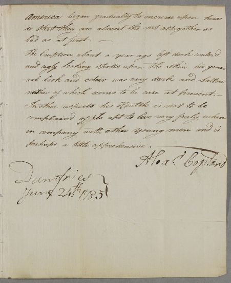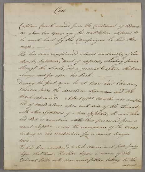 | Summary | Letter from Alexander Copland, concerning the case of Captain Craick, who 'arrived from the Continent of America above two years ago' and whose 'constitution appears to be much hurt by the Campaigns he had there made'. He has been treated with various forms of mercury, as he has exhibited 'Symtoms of a true Syphilis'. |