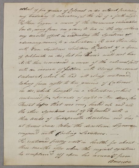 Letter from Alexander Copland, concerning the case of Captain Craick, who 'arrived from the Continent of America above two years ago' and whose 'constitution appears to be much hurt by the Campaigns he had there made'. He has been treated with various forms of mercury, as he has exhibited 'Symtoms of a true Syphilis'.