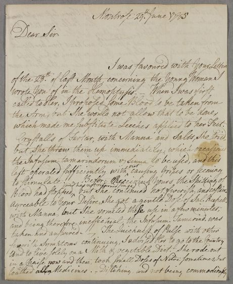 [ID:2649] From: Dr John Mudie (Moodie) / To: Dr William Cullen (Professor Cullen) / Regarding: Anonymous (Patient) / 29 June 1785 / (Incoming)
