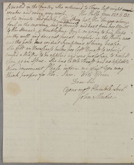 Letter from John Mudie, concerning the case of an unnamed female patient, 'the young woman I wrote you of in the Hemoptysis'.