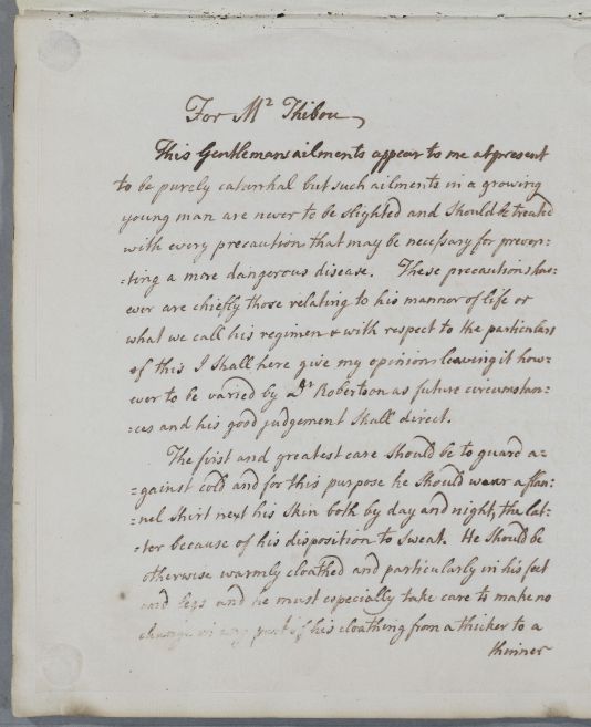 | Summary | Reply to Dr Robertson(?) with directions for Mr Thibou, a 'growing young man', whose ailments Cullen describes as 'purely cattarghal'. The letter seems incomplete, as it states 'for the rest see the next pages'. It's possible the 'next pages' are Doc Doc [ID:266] which seems to discuss the same case, but also seems to have been written (and possibly sent?) at a later point as Cullen uses it to reflect on the advice he has given here. |
