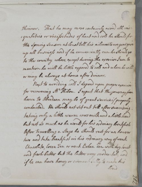 Reply to Dr Robertson(?) with directions for Mr Thibou, a 'growing young man', whose ailments Cullen describes as 'purely cattarghal'. The letter seems incomplete, as it states 'for the rest see the next pages'. It's possible the 'next pages' are Doc Doc [ID:266] which seems to discuss the same case, but also seems to have been written (and possibly sent?) at a later point as Cullen uses it to reflect on the advice he has given here.
