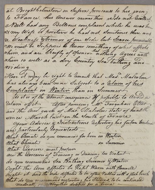 Case of Neil Malcolm, a youth of sixteen who, after two attacks of fever, has suffered bouts of St Vitus' Dance for which, on the advice of various physicians, he has been undertaking sea-bathing at Boulogne-sur-mer in Normandy. |