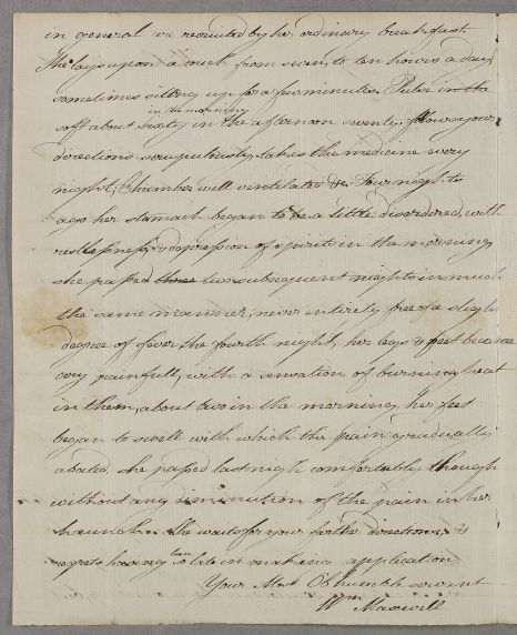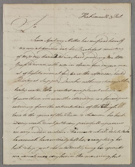 | Summary | Letter from William Maxwell, concerning the case of his mother. He notes that, since April, 'Mother has confined herself to a very abstemious diet'. Her greatest complaint is a 'pain extending from the articulation of the Thigh bone to the spine of the Ilium & Sacrum'. Her spirits still suffer in the morning, and she suffered a slight degree of fever accompanied by burning heat and swelling of her feet. |