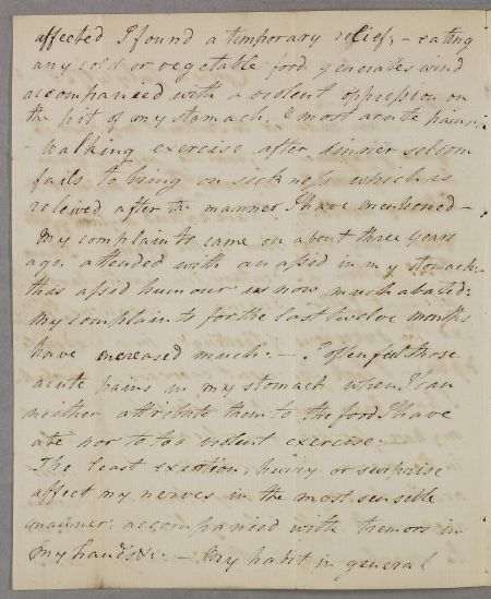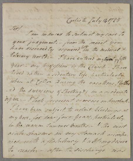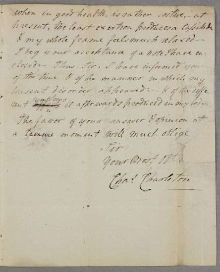 | Summary | Letter from Reverend Charles Charleton, concerning his own case. He was 'induced to submit my case to your judgement, from the merit you have deservedly acquired both in the medical & literary world'. Letter dated July, yet annotations have June implying that the author put the wrong month at head of letter. This dating also makes more sense when read next in sequence. |