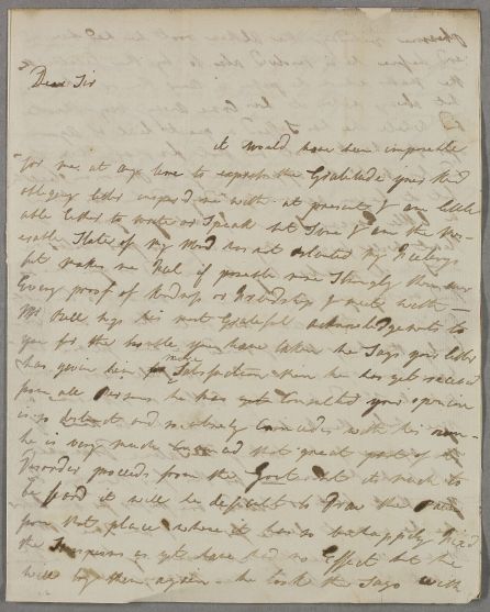 | Summary | Letter from Margaret Bell to Mr Bruce of Arnot, concerning the case of her husband, Governor Bell, who has a painful urinary tract ailment, which he believes is gouty in origin. She asks him to consult Cullen or Monro about his case. Her handwriting is poor and hard to decipher in places: she explains she is writing at 5 a.m., while her husband is asleep. She seems distraught: 'O Mr Bruce you often see the Person who is Dearest to you in Distress but God forbid you should ever see her in Agony from which no [care?] no assistance can relieve'. |