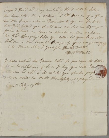 Letter from Margaret Bell to Mr Bruce of Arnot, concerning the case of her husband, Governor Bell, who has a painful urinary tract ailment, which he believes is gouty in origin. She asks him to consult Cullen or Monro about his case. Her handwriting is poor and hard to decipher in places: she explains she is writing at 5 a.m., while her husband is asleep. She seems distraught: 'O Mr Bruce you often see the Person who is Dearest to you in Distress but God forbid you should ever see her in Agony from which no [care?] no assistance can relieve'.