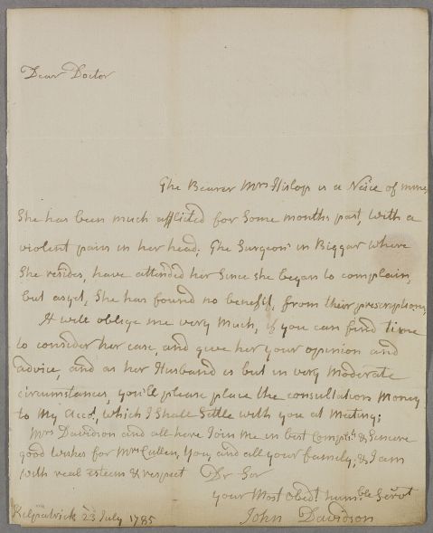 | Summary | Letter from John Davidson concerning the case of his niece, Mrs Hislop, who has 'been much afflicted for some months past, with a violent pain in her head'. |