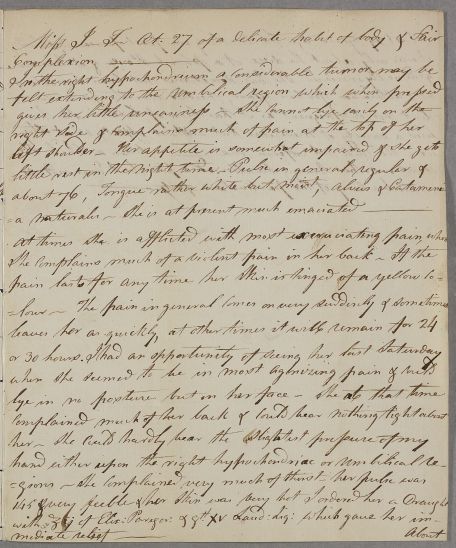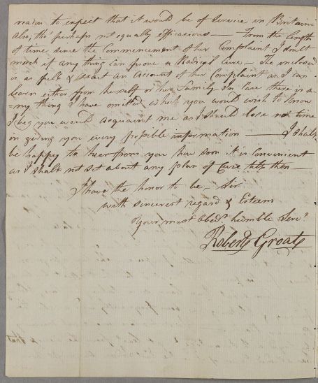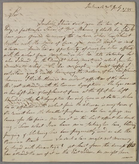 [ID:2673] From: Dr Robert Groat / To: Dr William Cullen (Professor Cullen) / Regarding: Miss I. T. (Patient) / 30 July 1785 / (Incoming)