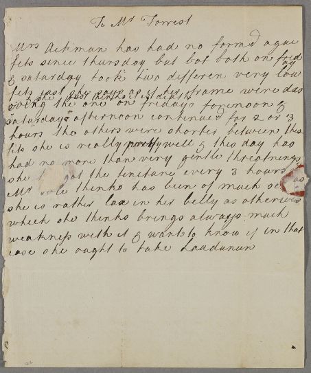 | Summary | Letter from an unnamed correspondent to Mrs Forbes, concerning the case of Mrs Aikman. |