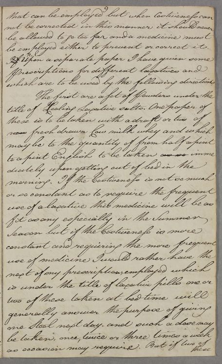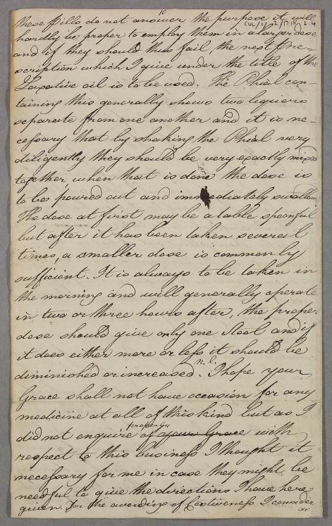 Draft letter to the Duke of Gordon, outlining directions and giving recipes for cooling laxative salts, laxative pills, laxative oil and an aperient solution.
