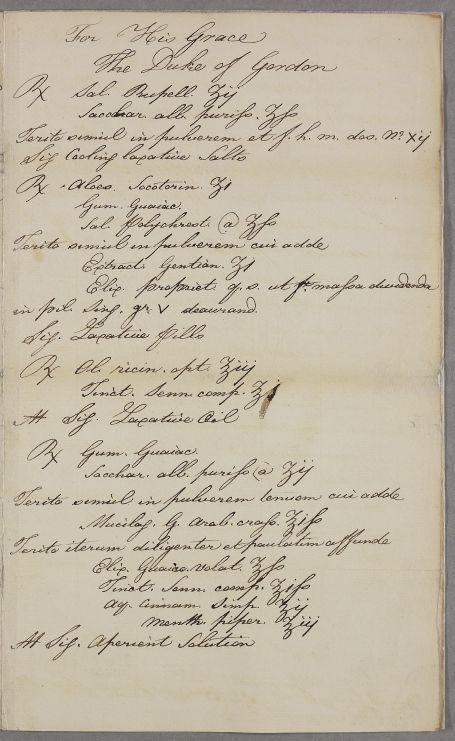 | Summary | Draft letter to the Duke of Gordon, outlining directions and giving recipes for cooling laxative salts, laxative pills, laxative oil and an aperient solution. |
