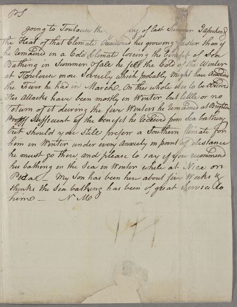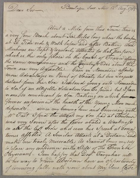 Letter from Neill Malcolm, Boulogne sur Mer, concerning 'the attack my son had at Toulouse'. He writes of their surroundings in France, including 'a very fine Beach about Six Miles long where the Company at [?] Tide ride & Walk before and after Bathing and Machines are kept & regularly attended for that purpose', although he 'cannot bring myself to place any confidence in the skill of the French Physicians'.