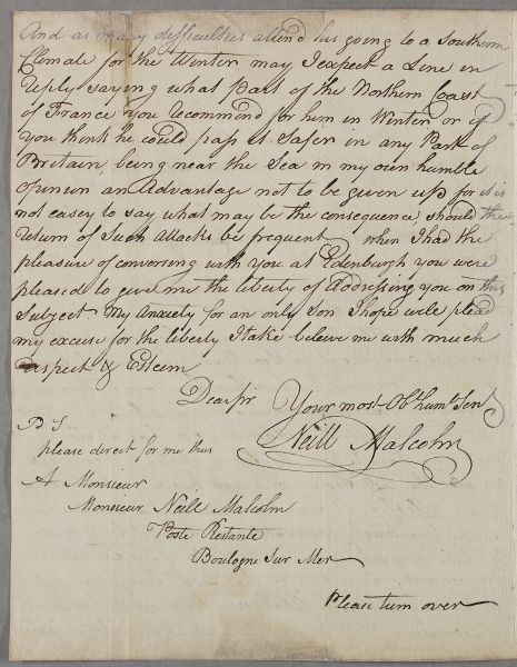 | Summary | Letter from Neill Malcolm, Boulogne sur Mer, concerning 'the attack my son had at Toulouse'. He writes of their surroundings in France, including 'a very fine Beach about Six Miles long where the Company at [?] Tide ride & Walk before and after Bathing and Machines are kept & regularly attended for that purpose', although he 'cannot bring myself to place any confidence in the skill of the French Physicians'. |