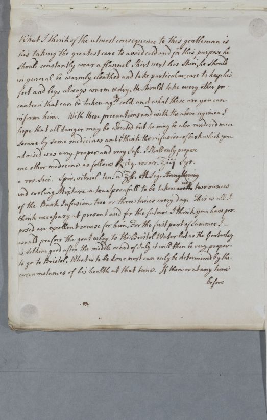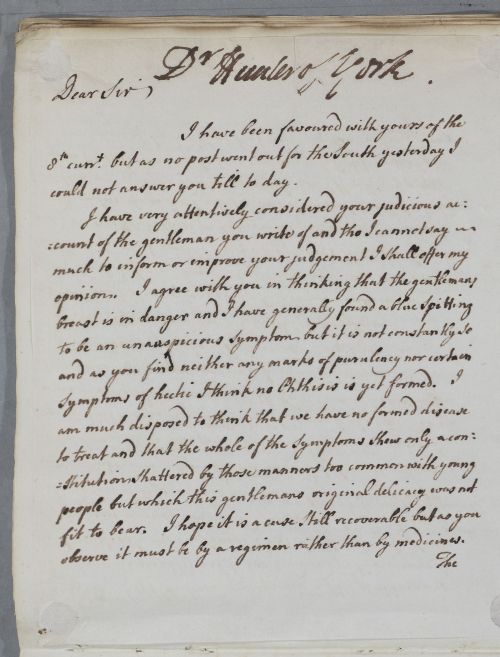 Reply, 'Dr Hunter of York'. Directions for one of Dr Alexander Hunter's patients, Mr William Huddleton Williamson, as described in a letter of the 8th.