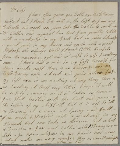 Letter from Elizabeth Watt to her cousin Mrs Robert Brown, concerning her own case. She asks the addressee to visit Cullen on her behalf, adding that although 'I have often given you troble on the following subject [...] I think this will be the last as I am very Delicate and weak now'. She complains of weakness in her back, stiff legs, a sore breast and nostril, rheumatism, and a bad taste in her mouth.