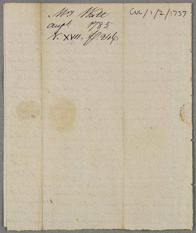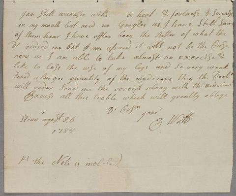 | Summary | Letter from Elizabeth Watt to her cousin Mrs Robert Brown, concerning her own case. She asks the addressee to visit Cullen on her behalf, adding that although 'I have often given you troble on the following subject [...] I think this will be the last as I am very Delicate and weak now'. She complains of weakness in her back, stiff legs, a sore breast and nostril, rheumatism, and a bad taste in her mouth. |