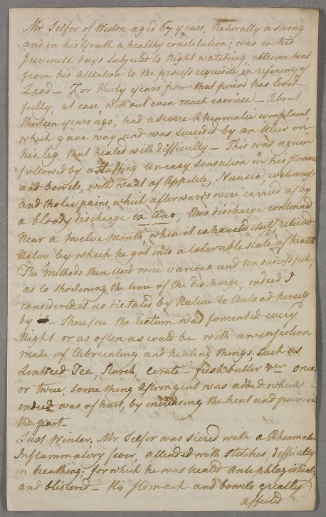 | Summary | Letter from Charles Rankine concerning the case of Mr Telfer of Weston, aged about 67, who worked in lead-refining as a young man, and now is weak and emaciated, and suffers from rectal bleeding. |