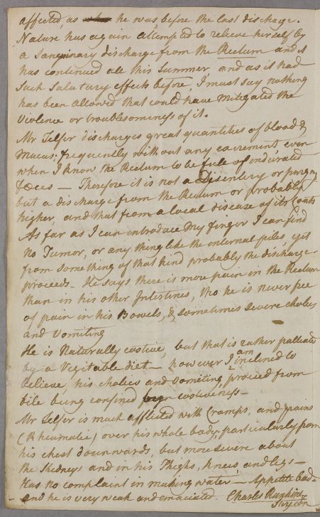 Letter from Charles Rankine concerning the case of Mr Telfer of Weston, aged about 67, who worked in lead-refining as a young man, and now is weak and emaciated, and suffers from rectal bleeding.