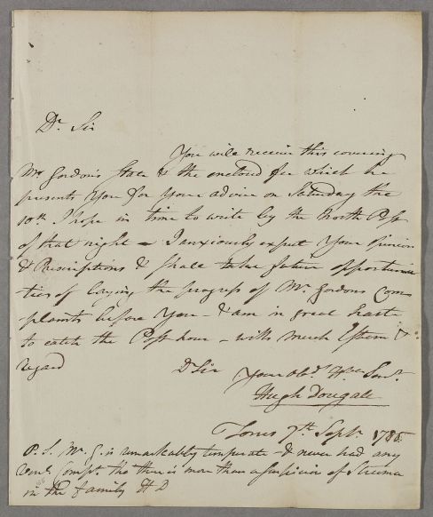 [ID:2700] Cover Letter and Case Note / Regarding: Mr John Gordon (of Greshop/Grieshop) (Patient) / 7 September 1785 / (Incoming)