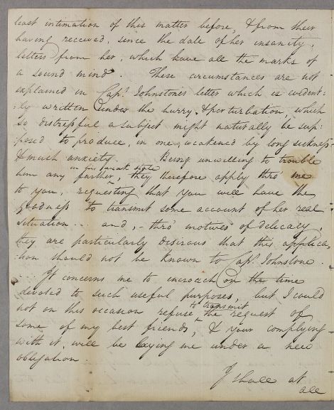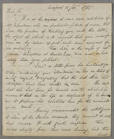 Letter from Dr James Currie concerning the case of Mrs Johnstone, the wife of Captain Gideon Johnstone of Hawkhill, who 'is now, or has lately been, your patient'. Mrs Johnstone's relations at Liverpool are perturbed at news that she has been insane for some time when their last communication with her suggested nothing was wrong with her.
