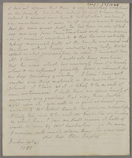 | Summary | Letter from Alexander Douglas, concerning the case of the son of Mrs Anstruther of Ardit. He is aged 33 and 'has in general been healthy, but supposed to have a moveable state of nerves', and has been 'uncommonly anxious about his health, inquisitive about nervous complaints & reading books upon that subject, which seem to have made some impression upon his mind'. |