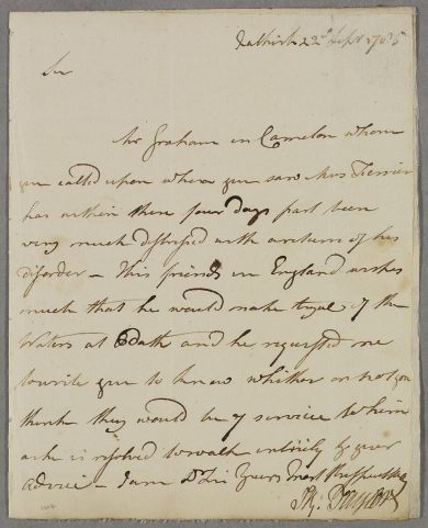 | Summary | Letter from Mr Taylor concerning the case of Mr Graham of Camelon, 'whom you called upon when you saw Mrs Ferrier'. His friends in England wish him to try the Bath waters. The annotation states "not copied". |