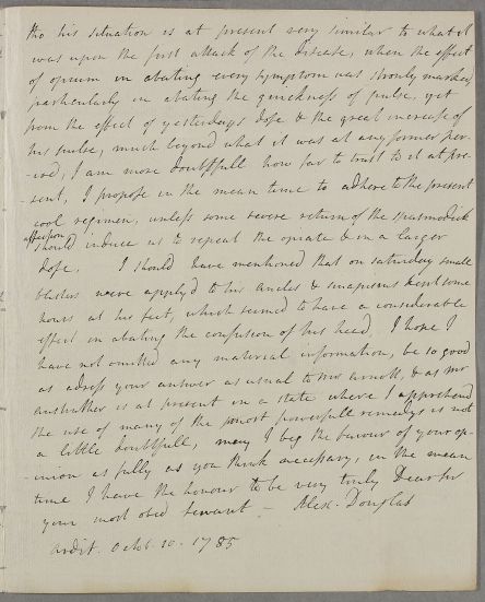 [ID:2717] From: Dr Alexander Douglas (Sir Alexander Douglas of Glenbervie) / To: Dr William Cullen (Professor Cullen) / Regarding: Mr John Anstruther (of Ardit) (Patient) / 10 October 1785 / (Incoming)
