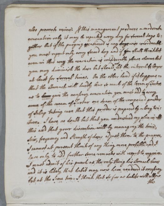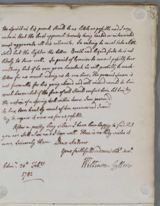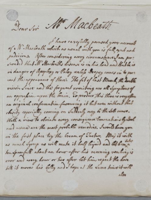 | Summary | Reply to [Andrew Liddell] regarding Mr Macbeath, who Cullen believes is 'in danger of Apoplexy or Palsy unless Dropsy comes in to prevent the appearance of these'. |
