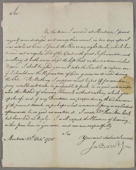 Case of Mr James Bisset who in 1784 has recently visited Cullen regarding gout in his ankle; by 1785 he is being described by a brother as very valetudinary when about to call on Cullen again. |