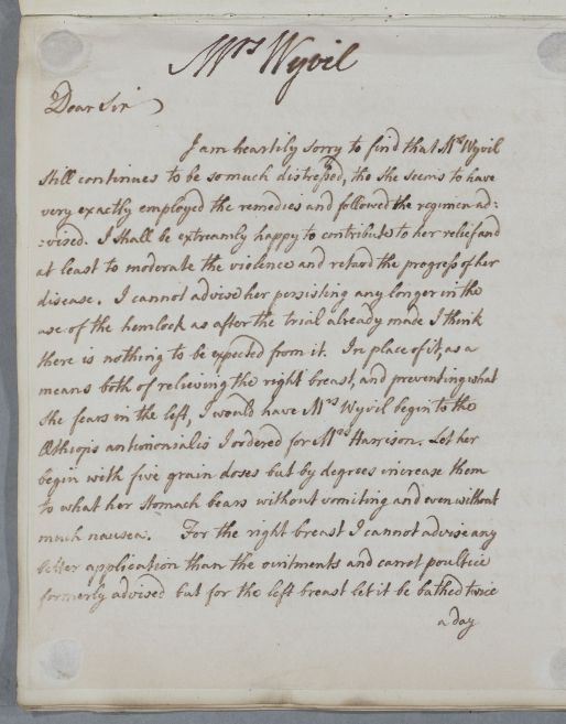 Reply, for 'Mrs Wyvil'. Addressed to Richard Story, concerning Mrs Wyvil's breast cancer. Also mentions Mrs Harrison.