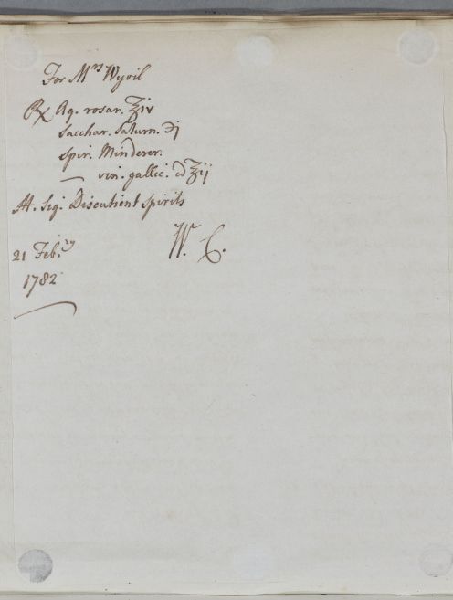 Take four ounces of Rose water, one scruple of Sugar of Lead, and two ounces each of Spirit Minderer and French brandy Mix. Label: Discutient Spirits