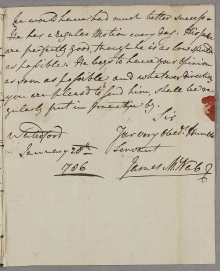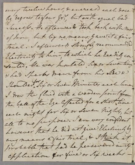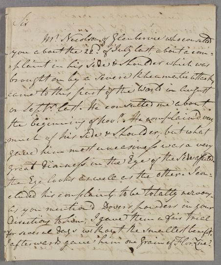 | Summary | Letter from James McNab, in Waterford, concerning Mr Nicolson of Glenbervie, who consulted Cullen 'about the 22d. of July last, about a complaint in his side & shoulder which was brought on by a severe Rheumatic attack', and has been living in the area since August. He now complains of a dimness in the eye of the side affected. McNab has treated him with electricity, but believes that the patient did not give it a fair trial and should have persevered with it. |
