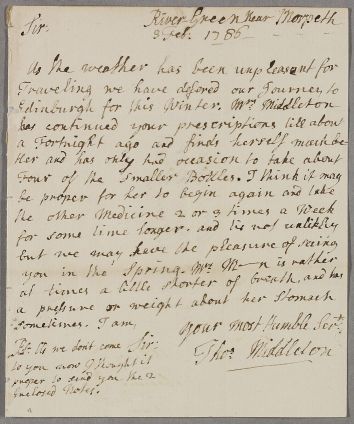 | Summary | Letter from Thomas Middleton, concerning his wife's case. They were planning to travel to Edinburgh for the winter, but have deferred the journey due to the unpleasant weather. |