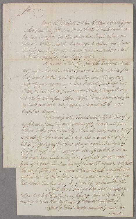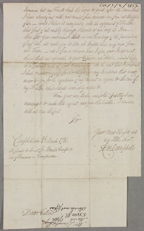 | Summary | Letter from Donald Campbell, concerning his own case. He had previously lived in Jamaica, and is keen to return there, 'but my Friends think the risque too great, after the severe Shock I have already met with'. |