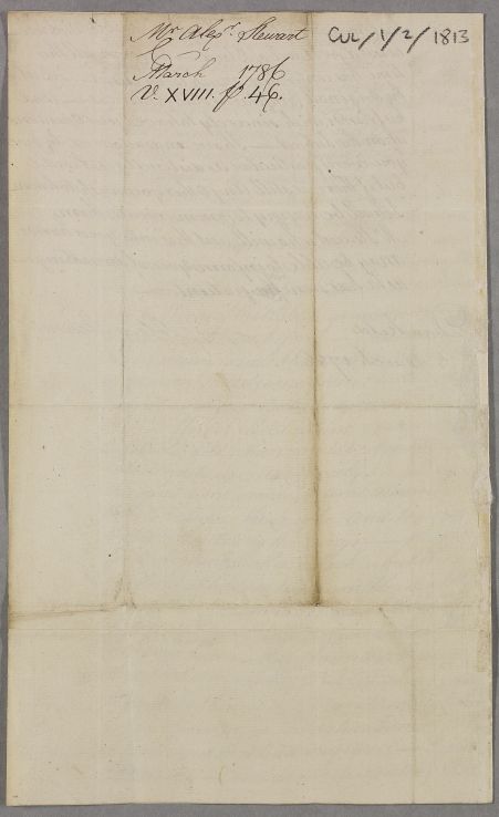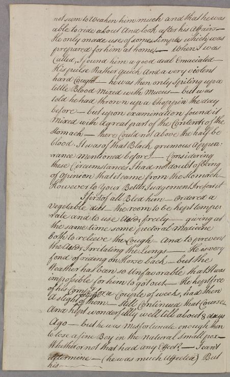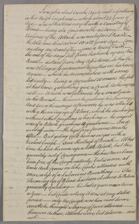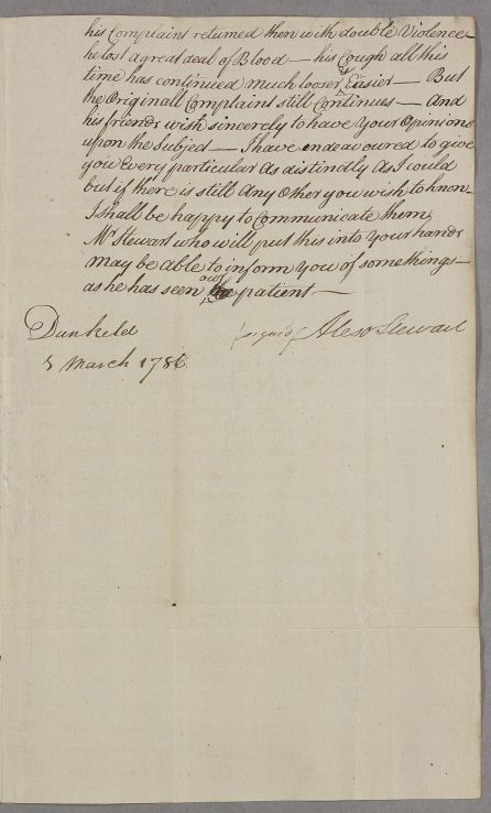 | Summary | Letter from Alexander Stewart concerning an unnamed patient, 'a Gentleman in this neighbourhood'. Six weeks ago the man was 'very ill with a vomiting of Blood'; ten years before, when 'a client of his' had fallen, he had lifted her back onto her horse and 'felt something give a Crack', followed a few days later by vomiting blood. |