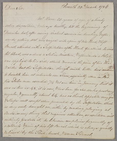 | Summary | Letter from Richard Story concerning the case of Mr Vane, who suffered from a violent pain in his head and breast 'after using violent exercise in hunting'. |
