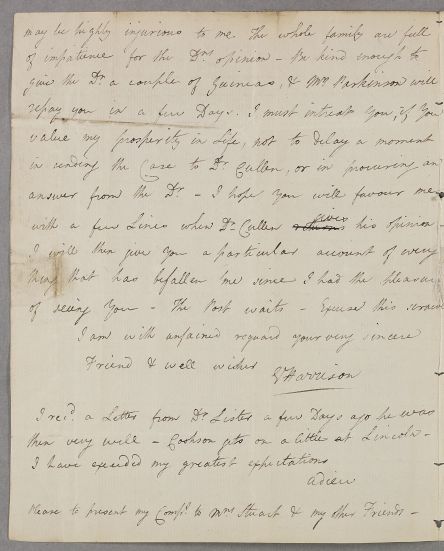 | Summary | Letter from E. Harrison to Dr Charles Stuart. He has a commission to write for the Encyclopaedia Britannica on midwifery, and had hoped Stuart would help but had not heard from him. He also asks Stuart to put the case of Master Wood to Cullen, saying of Wood's father that 'his anxiety for Master Wood is so great, that the smallest delay may be highly injurious to me', and asking Stuart to send the case to Cullen without delay 'if you value my prosperity in life'. |