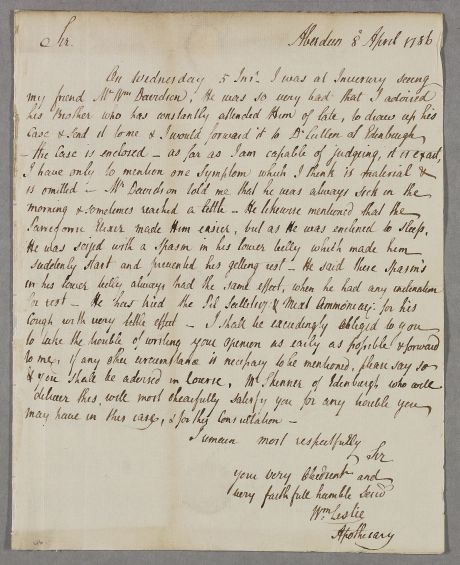 | Summary | Letter from William Leslie, an apothecary, on the case of William Davidson. |