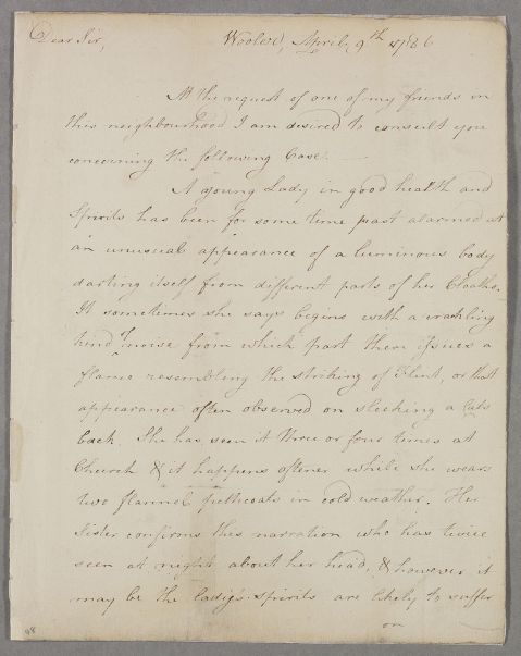 Letter from T. Trotter concerning the case of an unnamed female patient who 'has been for some time past alarmed at an unusual appearance of a luminous body darting itself from different parts of her cloaths'. He also mentions just having published a work on scurvy.