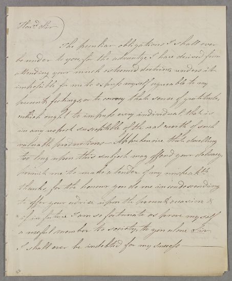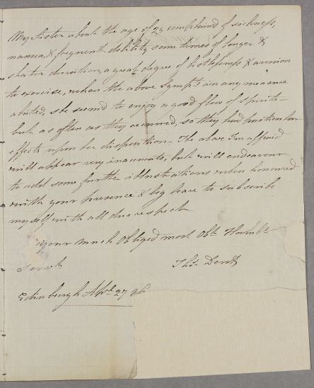 | Summary | Letter from Thomas Dent, thanking Cullen effusively 'for the advantage I have derived from attending your much esteemed doctrine' and relating the cases of his mother, "about the age of 50 of a delicate texture", who suffers from stomach trouble and headaches, and his sister, aged 25, who suffers from nausea and debility. |
