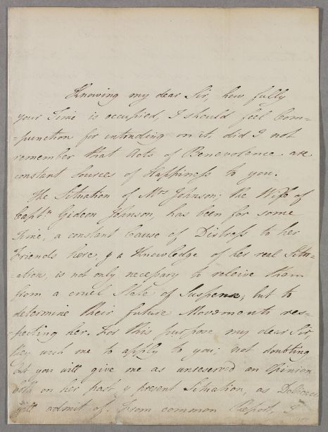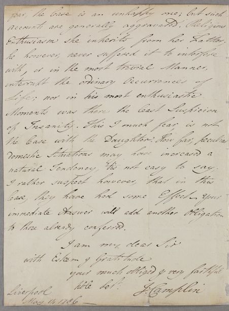 Letter from Dr J. Camplin concerning the case of Mrs Johnston, the wife of Captain Gideon Johnston. He asks Cullen for an account of her situation, for the sake of her 'friends' (i.e. family) in Liverpool. Insanity, probably of a religious kind, seems to be suspected, as he writes that 'Religious Enthusiasm she inherits from her Father', although in his case, there was not 'the least Suspicion of Insanity'. His remark 'How far, peculiar domestic Situations may have increased a natural Tendency, 'tis not easy to say' may hint at the cause of disease indicated in Doc ID 4960. Mistakenly annotated 'C. Mr. Johnston'.