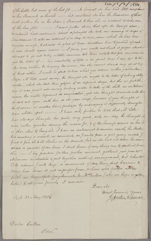 [ID:2816] From: Mr John Forbes / To: Dr William Cullen (Professor Cullen) / Regarding: Mrs Aikman (Patient) / 21 May 1786 / (Incoming)