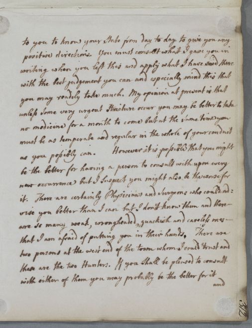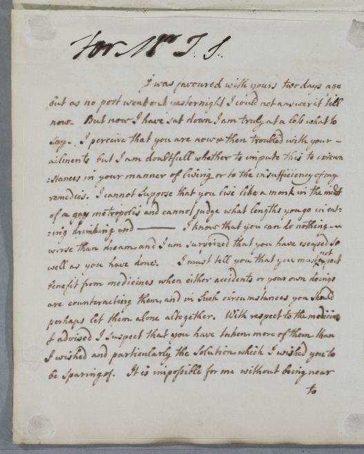 Reply 'For Mr J. S.' Cullen chides him for not following earlier directions, adding that 'I cannot suppose you live like a monk in the midst of a gay metropolis', and recommends that if he wishes the advice of a physician or surgeon in London he should consult the Hunters.