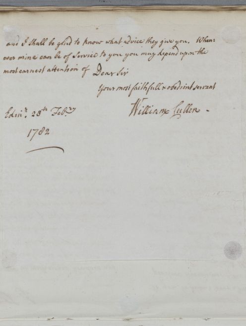 | Summary | Reply 'For Mr J. S.' Cullen chides him for not following earlier directions, adding that 'I cannot suppose you live like a monk in the midst of a gay metropolis', and recommends that if he wishes the advice of a physician or surgeon in London he should consult the Hunters. |
