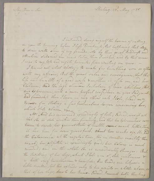 [ID:2820] From: Dr John Aird / To: Dr William Cullen (Professor Cullen) / Regarding: Mrs Aird (Patient) / 23 May 1786 / (Incoming)